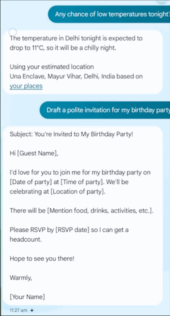 Now, here’s where things get interesting. You can also directly ask Gemini for help inside your chats. For example, let’s say you’re organizing a birthday party and need to send an invitation. Just type something like, “Draft a polite invitation for my birthday party” or “Write a casual apology for replying late to a message”.